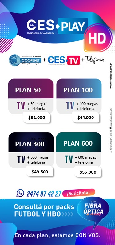 CES Play es el servicio de Internet, televisión y telefonía fija que ofrece la Cooperativa Eléctrica de Salto, a través de diferentes planes de acuerdo a tus necesidades o disponibilidad geográfica.