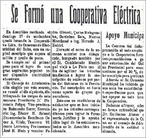 Luego, llegó la gran asamblea en el Teatro Roma… Ésta fue unánime, logrando la adhesión de los vecinos… La Cooperativa Limitada de Consumo de Electricidad del Salto, fue oficialmente fundada el 27 de Noviembre de 1955, con el propósito de satisfacer la problemática descripta a través de la modernización de las instalaciones existentes, y la provisión de un servicio eléctrico masivo e integrador, para todos los habitantes del partido de Salto.